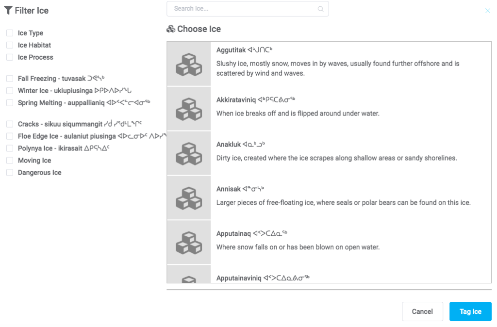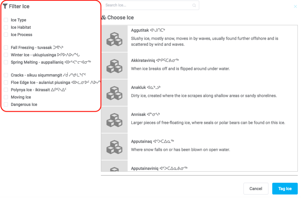 2. To simplify your choices, click one or more filters from the right hand column. Only the options in that category will appear on the right. For example, by clicking “Ice Habitat”, only ice habitats, such as Polynya, will appear on the right column.