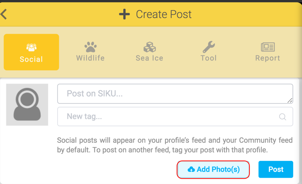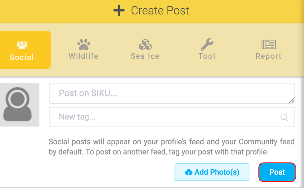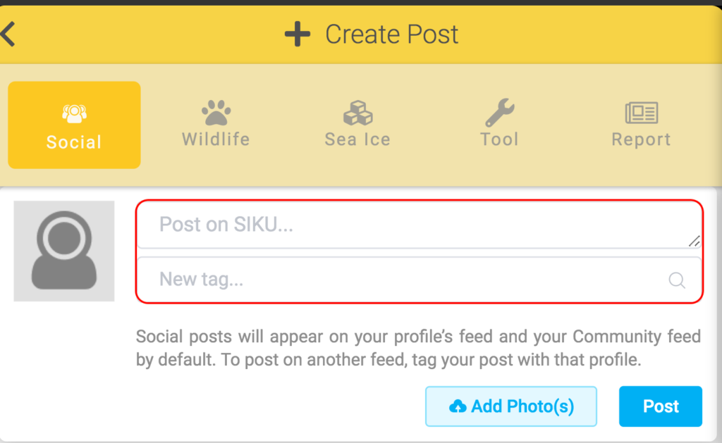 3. Type your post in the “Post on SIKU” box. Use the “New tag” box to add a location or tag another member on SIKU in your post.