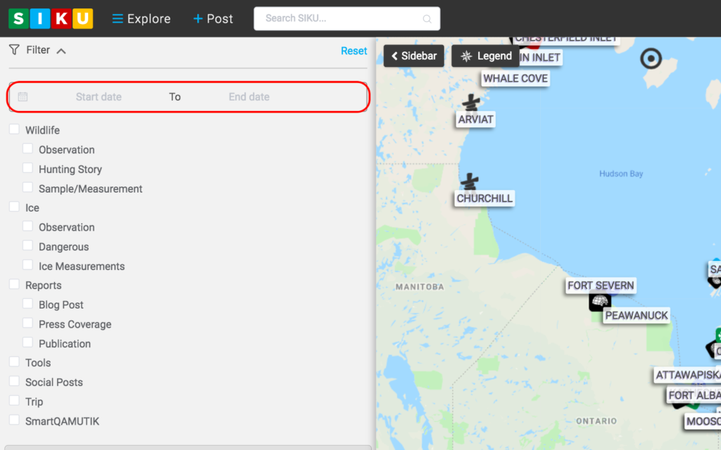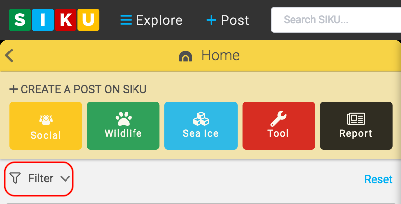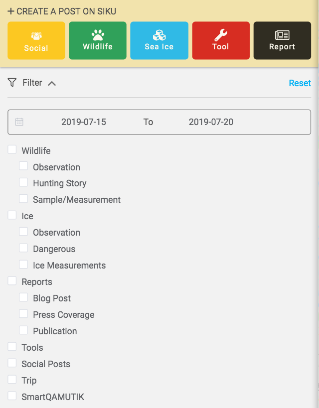 - The pull down menu will also display the different types of post that can be displayed on your social feed. Use the mouse to click on which types of posts you want displayed on your feed. You can click individual boxes such as “Observation” or you can click on the headings such as “Ice” or “Wildlife” to display all posts pertaining to ice types or wildlife.