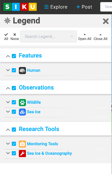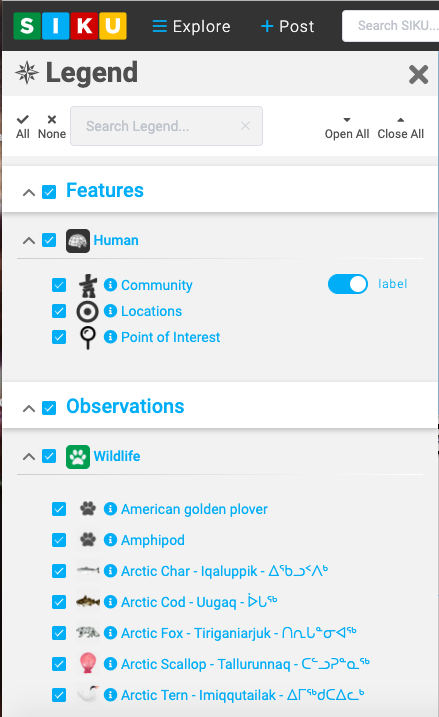 - In this image, the Open All option is pictured. You can individually click on/off the options, or you can choose entire headings (Human, Wildlife, etc.) You can also select all or none using the options on the top left next to the search box. Use the search box to type in a specific item you want displayed.