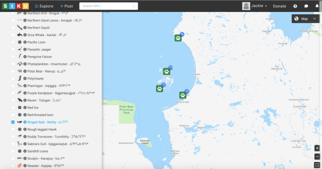 - In this example, the seal has been selected from the wildlife options, and the results appear on the map.