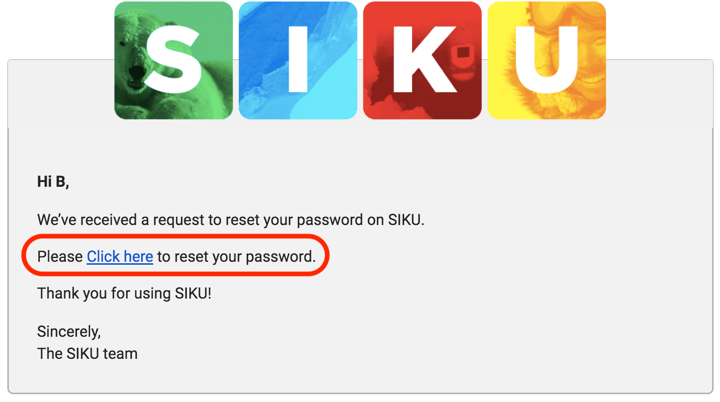 - Check your email and you should have an email from SIKU. Inside the email click the Click here link.