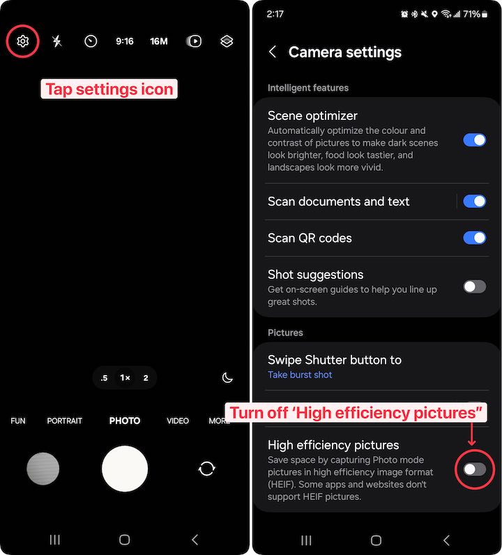 Learn how to turn off the “High-efficiency pictures” setting in your Android Camera app.
